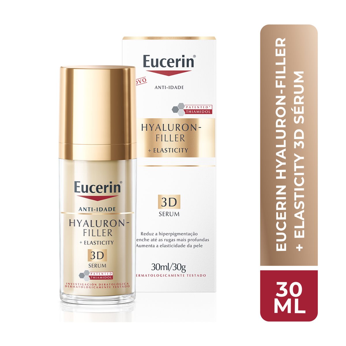 Eucerin Hyaluron-Filler+Elasticity 3D Sérum Facial Antirrugas é um produto ideal para reduzir rugas profundas e linhas de expressão, desenvolvido com Ácido Hialurônico de cadeias curtas e longas, que hidrata, preenche rugas profundas e estimula a produção de ácido hialurônico. Sua fórmula também contêm Thiamidol, um ativo reconhecido pelos dermatologistas como o mais eficaz e o único comprovado por atuar na causa raiz das manchas, e Arctiin, que acelera a produção do colágeno na pele e, junto ao Ácido Hialurônico, melhora a elasticidade da pele.