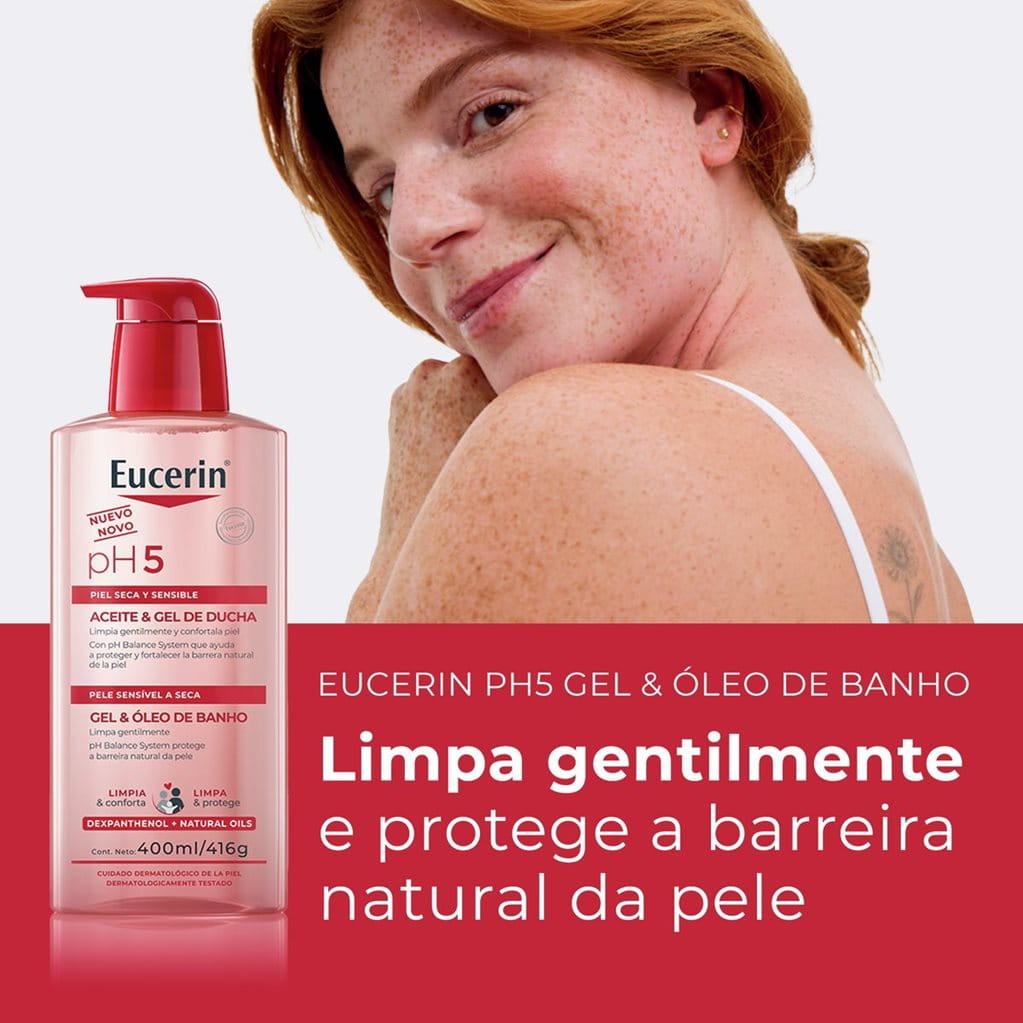 Dermatologicamente testado e desenvolvido especialmente para peles sensíveis. Possui em sua formulação Dexpantenol, que hidrata e repara a pele e Óleos naturais para reposição de lipídios. O Eucerin PH5 Gel e Óleo de Banho oferece limpeza suave e eficaz, protege a barreira natural da pele e não deixa resíduos. Proporcionando uma sensação de pele hidratada e macia, é ideal para uso diário e pode ser usado no rospo e corpo. É também adequado para crianças a partir de 3 anos.